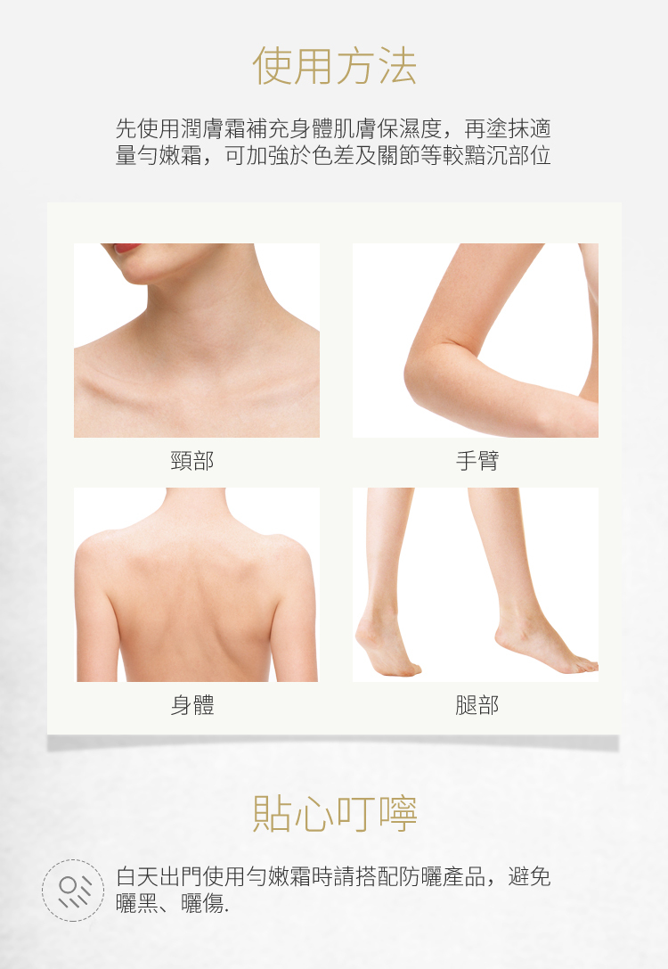 淬鍊平滑、淨白光澤,使肌膚更顯嬌嫩