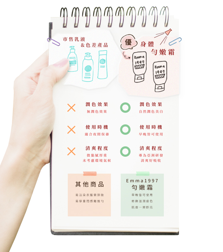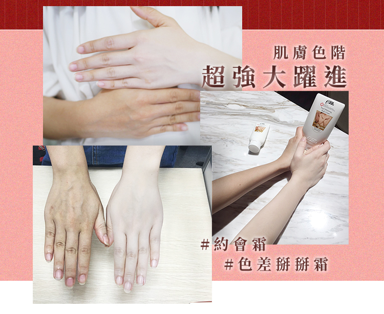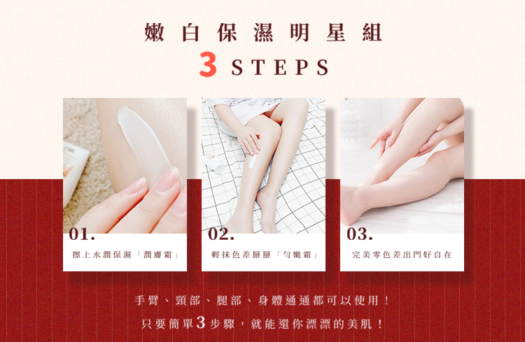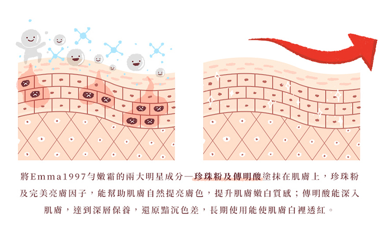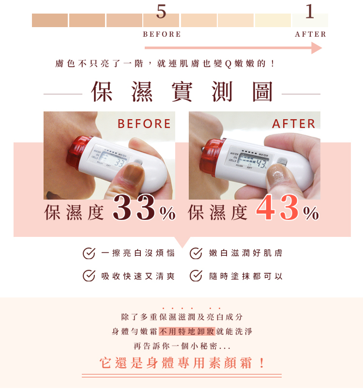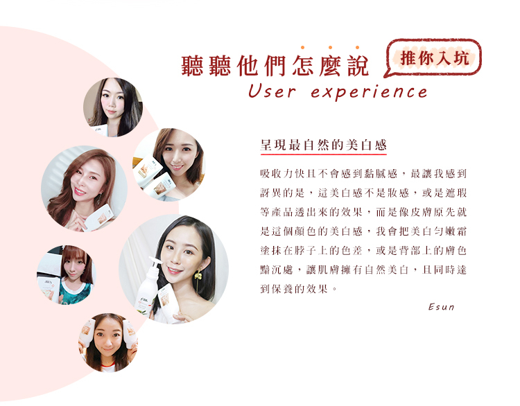 長時間 : 改善黯沉色差,持續使用,膚色越來越白皙透亮